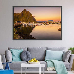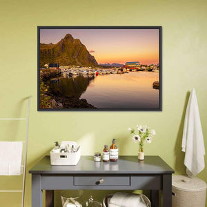 Marina of Svolvaer captures a serene harbor scene with docked boats, a village, and mountains mirrored in calm water at sunset. Rendered in a realistic style using blues, oranges, greens, and whites with a rule-of-thirds composition, it works well in modern living rooms and entryways.