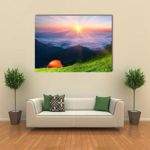 A peaceful, awe-inspiring mountain sunrise over Marmarosh Mountain, Ukraine, with a small orange tent pitched on a grassy slope. Rendered in a realistic landscape style with layered depth and sun rays bursting through clouds, the palette of orange, green, blue, pink and white creates a tranquil morning scene that suits modern living rooms or bedrooms.