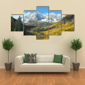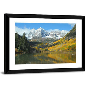 This landscape artwork captures the serene beauty of autumn, showcasing a tranquil lake framed by majestic mountains and vibrant foliage. The rich palette of greens, yellows, and blues invites you to experience the peaceful charm of nature.
