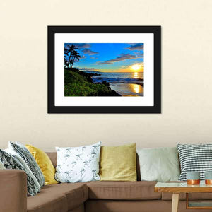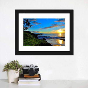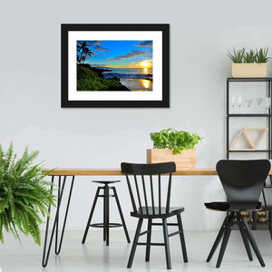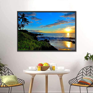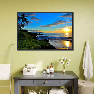 Maui Beach Sunset Canvas Wall Art depicts a photorealistic Maui beach at sunset, with palm trees, crashing waves and dramatic clouds. Vibrant blues and warm oranges create a serene, tropical atmosphere that feels peaceful and calm. It suits coastal or modern rooms looking for nature-inspired wall decor.