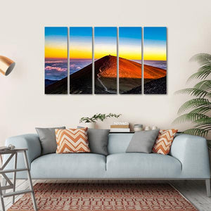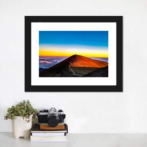 This striking canvas features the serene beauty of Mauna Kea, capturing the awe-inspiring mountain peak under a dramatic sky filled with clouds. The vibrant palette of blues, oranges, and earthy browns enhances the peaceful atmosphere of this stunning landscape.