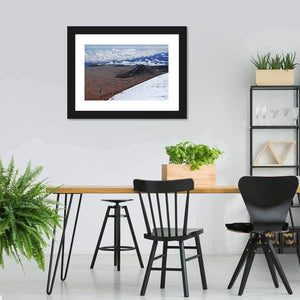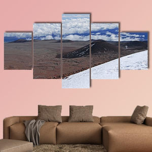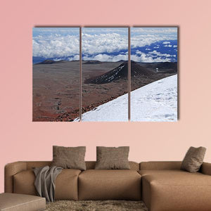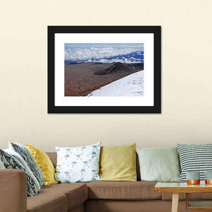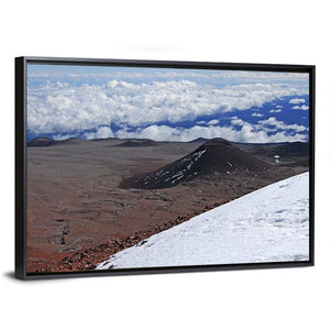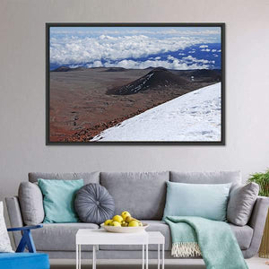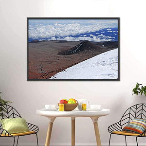 Mauna Kea Volcano Canvas Wall Art depicts a realistic volcano framed by snow and cloud above reddish-brown, barren ground. The wide, quiet scene feels vast, serene and slightly desolate, and suits modern or nature-inspired rooms.