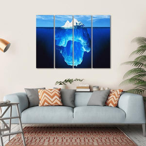 A dramatic, realistic depiction of an iceberg and the Antarctic ocean, shown in a split underwater and above-water view. Sunlight filters through the aqua-blue water while clouds sit above the cold, vast scene, creating a powerful, quiet mood. This canvas works well in modern or coastal-inspired interiors as a nature-focused focal point.