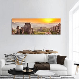 Monastery Of Rousanou captures a monastery clustered on distinct rock pillars above a layered valley at sunset, with hazy mountains in the distance. The warm orange, yellow and brown palette and serene, majestic mood work well in modern or nature‑inspired rooms as thoughtful wall decor.