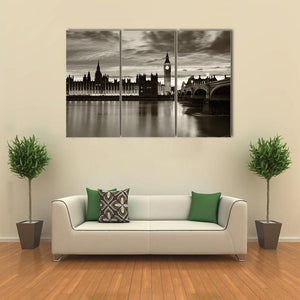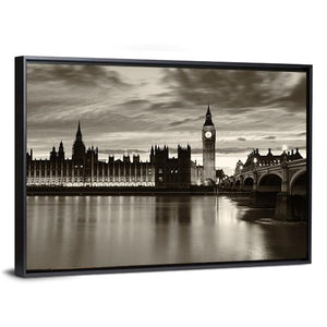 Monochrome Big Ben Canvas shows Elizabeth Tower and the Palace of Westminster in a sepia-toned cityscape, with the clock face visible and reflections on the River Thames. Its vintage, dramatic yet serene mood works well in London-themed or modern rooms.