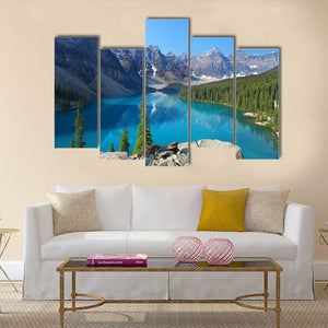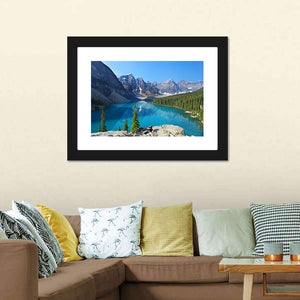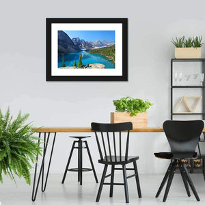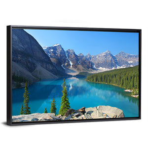 This stunning canvas print captures the serene beauty of Moraine Lake, framed by majestic mountains and a clear blue sky. The tranquil scene, featuring deep blues and greens, invites a peaceful atmosphere into any space.