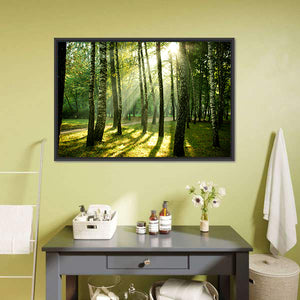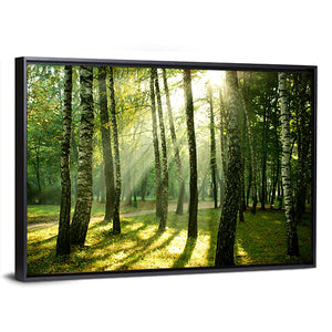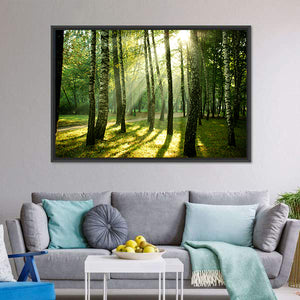This landscape artwork captures a serene birch forest bathed in soft sunbeams and dappled sunlight. The tranquil palette of greens, browns, and yellows evokes a calming atmosphere, making it an ideal addition to any nature-inspired decor.