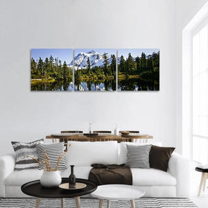 Mount Baker Lake Panoramic Canvas shows Mount Baker above a calm lake, framed by coniferous trees and a clear reflection. Its serene, majestic mood and realistic nature style suit modern or nature-themed interiors.