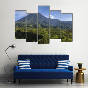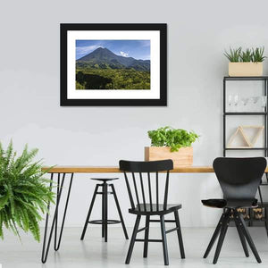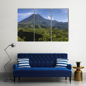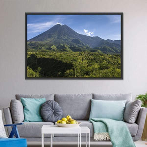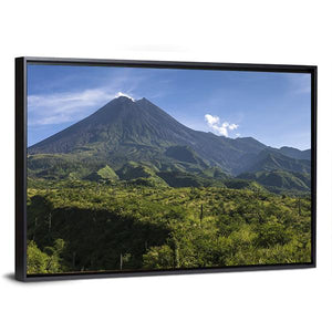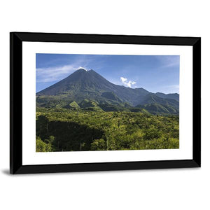 This breathtaking canvas art features the majestic Mount Merapi, showcasing its smoking peak amidst lush green foothills. The serene atmosphere is enhanced by a clear blue sky adorned with wispy clouds, making it a perfect addition to your wall decor.
