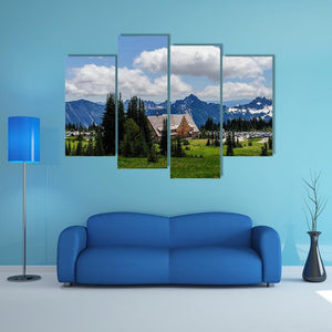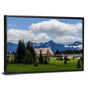 Mount Rainier In Summer shows a peaceful summer scene of a snow-capped mountain range with a lodge-style wooden building, pine trees, a grassy field, and soft clouds. The green, blue, brown and white palette and rustic style create a serene, scenic atmosphere that suits modern or rustic room decor in home living spaces.