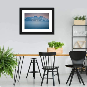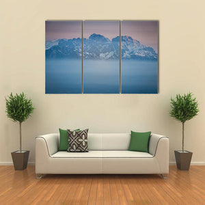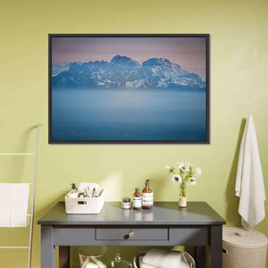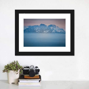 Mount Schiara Peaks Canvas Wall Art depicts snow-capped mountains softened by a hazy fog, rendered in a cool blue, white, purple and gray palette. The scene feels serene and majestic and works well in modern living rooms or bedrooms with nature-inspired decor.