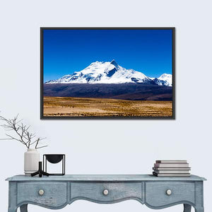 Capture the grandeur of Mt Shishapangma with this stunning canvas print featuring a snow-capped peak against a vast blue sky and barren plains. Its serene and cold palette invites calm and reflection, making it a captivating addition to any space.