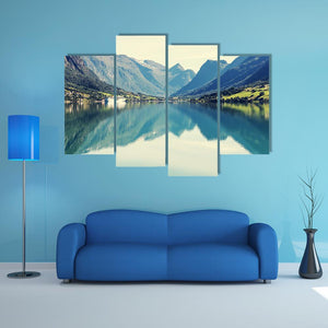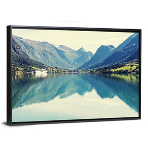 This canvas features a serene landscape of snow-capped mountains and a tranquil lake, reflecting a distant village. The peaceful color palette of blue, green, and grey adds a calming vibe, making it perfect for any room.