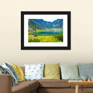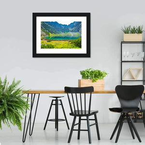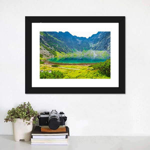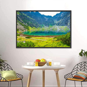 A photorealistic canvas print of a mountain lake, showing green mountains, blue water and a clear reflection. The rule-of-thirds composition and layered foreground—grassy edge and rocky slopes—give the scene depth and a serene, majestic atmosphere. Works well in modern, nature-inspired living spaces.