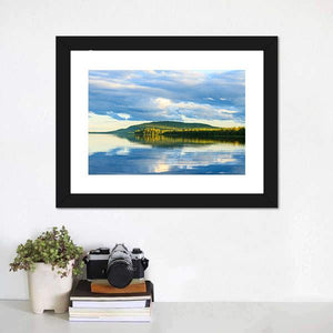 Lake With Beautiful Clouds shows a calm lakeside scene with clouds mirrored on the water and forested hills along the shore. The rule-of-thirds composition and a soft blue-green palette give the print a serene, peaceful feel. It pairs well with modern home decor and fits nicely in living rooms or bedrooms.