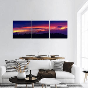 A panoramic mountain scene at twilight featuring a vibrant gradient sky and a silhouetted tree line. The composition balances dramatic and serene tones—purple, pink, orange, yellow, blue, and black—making it a fine fit for modern room decor such as living rooms or offices.