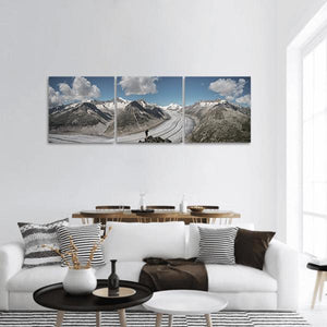 A photorealistic panoramic landscape of mountains and a vast glacier, with a lone figure on a rocky outcrop beneath a wide, cloud-scattered sky. Cool blues, grays, whites and touches of green create a serene, majestic mood that suits modern living rooms, offices, or entryways.