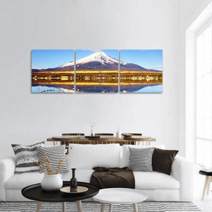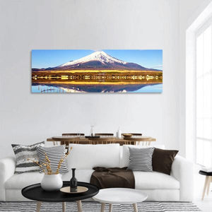 Mt Fuji with Lake Yamanaka is a panoramic canvas print showing a snow-capped mountain and its clear reflection in the lake. The photorealistic image uses blues, whites and touches of gold and brown to create a serene, majestic atmosphere that suits modern or nature-inspired rooms.