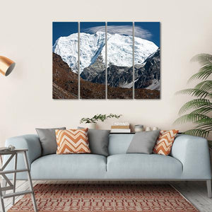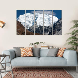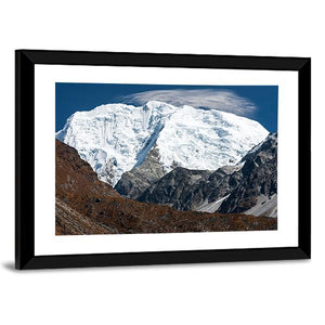 Experience the serene beauty of Mt Shishapangma, a majestic snow-capped mountain range set against rocky slopes and clouds. This artwork captures the intricate ice formations and dark, textured rocks that define this remote landscape in Nepal.