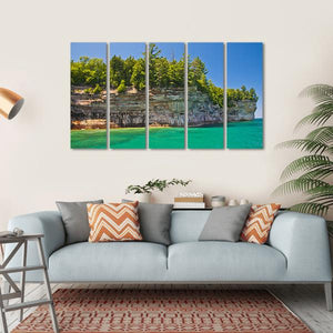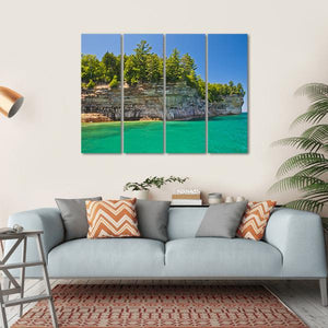 This canvas wall art captures the serene beauty of Pictured Rocks National Lakeshore, showcasing its striking coastal cliffs, lush trees, and clear turquoise waters. The realistic portrayal and natural color palette evoke a sense of tranquility, making it a beautiful addition to any living space.