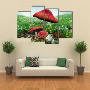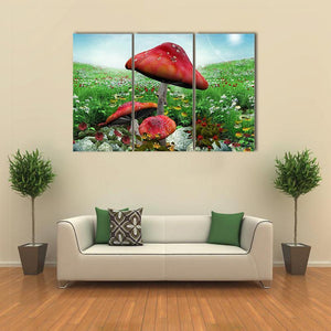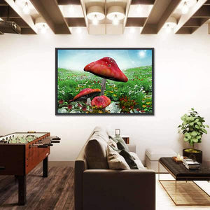 This enchanting piece features three large red mushrooms surrounded by a grassy field dotted with white and yellow flowers, all under a bright blue sky. It brings a whimsical and vibrant feel to your space, creating a serene atmosphere that's perfect for nature lovers.
