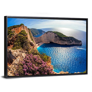 Capture the breathtaking beauty of Navagio Beach, framed by majestic coastal cliffs and the serene ocean. This vibrant artwork showcases a stunning fisheye perspective, with sun reflections dancing on the water and a boat gently floating in the distance.