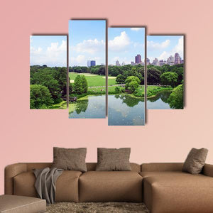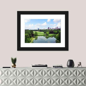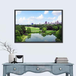 Central Park captured as a peaceful, scenic scene—pond, trees, green fields and the distant city skyline appear in a balanced, eye-level composition. The blue, green and brown palette brings a calm, urban oasis mood that suits modern home spaces. Use it as wall decor in living rooms or other house rooms that benefit from a touch of nature.