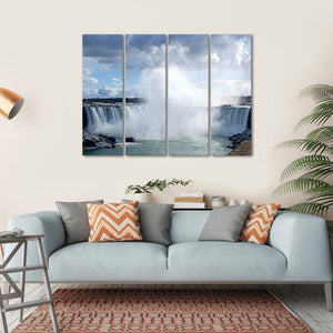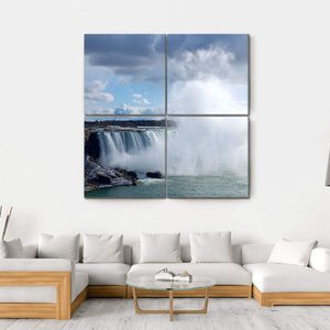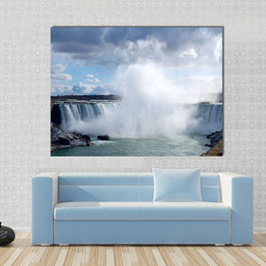 This canvas art captures the majestic Niagara Falls in a wide, horizontal view. With its powerful and dynamic depiction of water, mist, and partially frozen rocks, it evokes a serene atmosphere perfect for any nature lover's wall. The dramatic stormy clouds add depth to the scene.