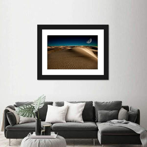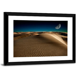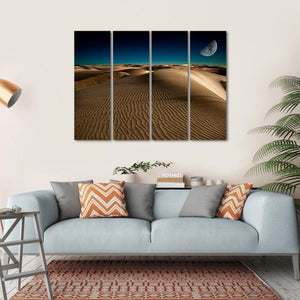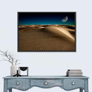 Capture the serene beauty of sand dunes beneath a crescent moon with this photorealistic canvas artwork. The dreamy palette of browns, tans, and blues evokes a vast desert night, making it a tranquil addition to any space.