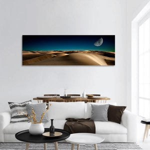 This panoramic canvas depicts layered desert dunes beneath a crescent moon, using a palette of tan, brown, deep blue, and grey. The modern, dramatic composition feels serene and vast and works well in modern or nature-inspired rooms.