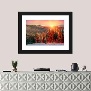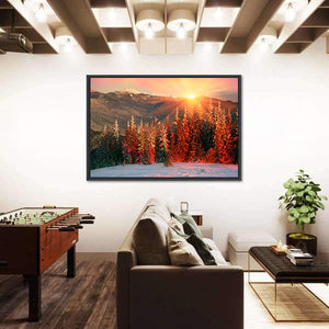 This canvas art captures a serene sunrise over the snowy mountains and pine trees of the Ukrainian Carpathians. The warm palette of pinks, oranges, and greens evokes a majestic atmosphere, perfect for adding a touch of nature to your decor.