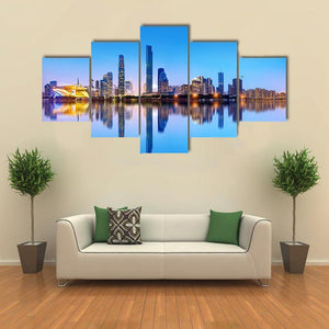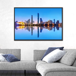 A night cityscape of the Pearl River with the Guangzhou skyline, showing skyscrapers and their mirrored reflections on the water. Cool blues and turquoise, with spots of yellow and orange window light, create a tranquil, modern urban mood. Fits well in modern living rooms, home offices, or contemporary room decor.