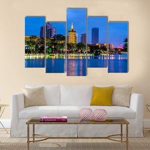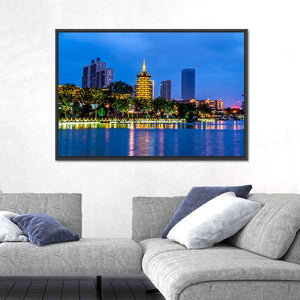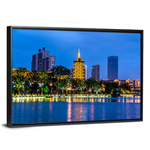 A photographic cityscape featuring Qingjiangpu Building and Huai'an’s skyline with a pagoda beside a calm lake. Twilight blues, soft yellows, and greens catch the lights reflecting on the water for a peaceful, vibrant atmosphere. Suited to modern room decor and wall art displays.