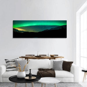 Photorealistic panoramic canvas showing the aurora borealis arcing above mountains in Sweden, with stars scattered across the night sky. The green, blue, and yellow tones create a magical, serene sense of scale that works well in modern living rooms, bedrooms, or quiet spaces.