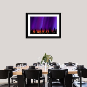 Aurora borealis ripples above a forest silhouette across a wide panoramic canvas, with vibrant purple, pink and orange light patterns. The ethereal, majestic and serene scene works well in modern or minimalist rooms as a calm nature-focused accent.