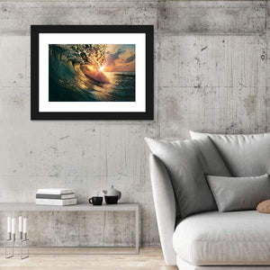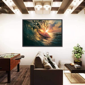 This canvas art captures the dramatic beauty of ocean waves illuminated by a stunning sunset. The vivid palette of blues, golds, and oranges creates a serene atmosphere, perfect for bringing the calming essence of nature into your space.