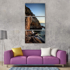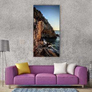 Ocean Waves Near Sea Rocks depicts coastal cliffs, a sea cave and foaming ocean waves captured from a low, dramatic perspective that emphasizes depth. Sunlit rock faces, vegetation on the cliff top and a brown-blue-gold palette create a dramatic yet serene, rustic coastal mood well suited to beach- or nature-inspired rooms.