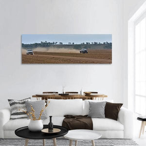 Two rally cars race along a dusty dirt road, kicking up a broad dust trail in a daytime scene. The realistic, panoramic image—brown earth, green trees and blue sky—gives an exciting, fast-paced, adventurous feel that works well in modern living rooms or game rooms.