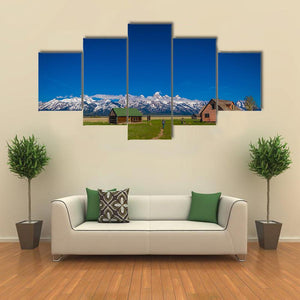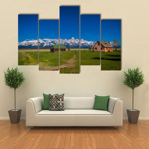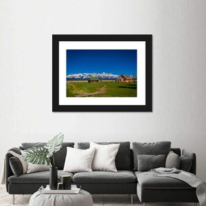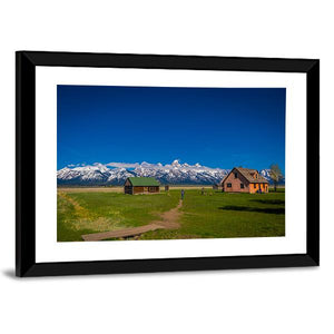 Old Mormon Barn Canvas Wall Art captures a wide mountain landscape centered on a weathered barn with nearby houses, a log cabin, a wooden bridge and open fields. The realistic nature-photography style uses blues, greens, white and warm browns to create a serene, majestic mood and fits farmhouse or nature-inspired room decor.