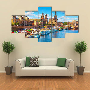Old Town With Elbe River Canvas Wall Art captures a vibrant, sunny riverside scene along the Elbe River with ornate riverfront buildings, domed towers and several boats docked. The eye-level view and realistic blues, beige, white and yellow bring a lively city atmosphere to living rooms or entryways with modern décor.