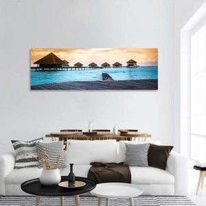 A photorealistic panoramic canvas of overwater bungalows and a pier in the Maldives, shown in a wide-angle view with calm blue water and warm orange-brown highlights. The tropical, daytime mood suits coastal or modern living rooms and bedrooms as a soothing ocean focal point.