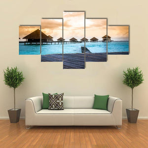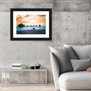 This serene canvas captures the beauty of overwater bungalows set against a tranquil ocean. The photorealistic scene, with its warm sunset hues of orange and cool blues, creates a tropical escape perfect for any space.