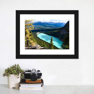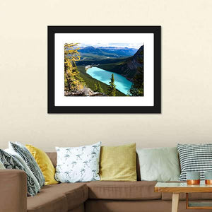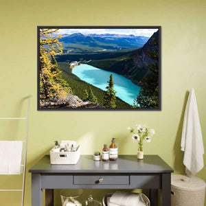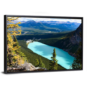 This canvas art captures a high-angle view of Lake Louise, framed by majestic mountains and lush forests. The serene scene is highlighted by a turquoise lake and rocky terrain, evoking a sense of vastness and tranquility, perfect for any nature lover.