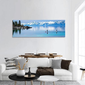 Two paddleboarders glide across a calm, blue mountain lake in this wide panoramic nature photograph, with snow-capped peaks and pine trees along the shoreline. The serene, peaceful mood and cool blue-green palette suit modern living rooms or bedrooms and bring a tranquil natural presence to room decor.