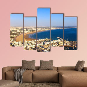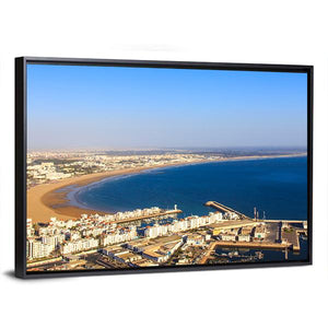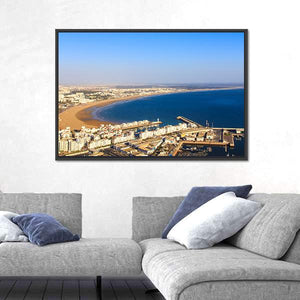 Agadir Cityscape Canvas Wall Art presents a photorealistic aerial view of a coastal city and its large beach. Calm blues, tans, and white create a serene daytime seaside mood that pairs well with modern or coastal-style room decor.