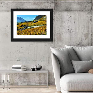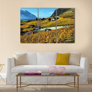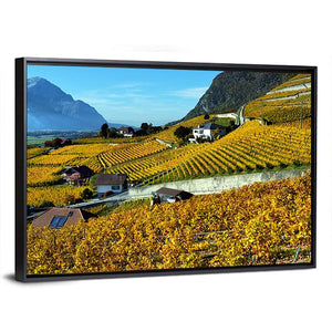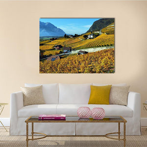 Panorama Of Autumn Vineyards Canvas Wall Art depicts rolling vineyards and scattered houses with misty mountains in the distance, rendered in warm yellows, greens, blues, and browns. The scene feels peaceful and rustic, with neat rows of grapevines and soft daytime light. Suited to nature-inspired or modern country rooms as a calm focal piece.