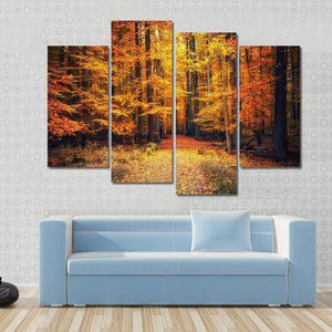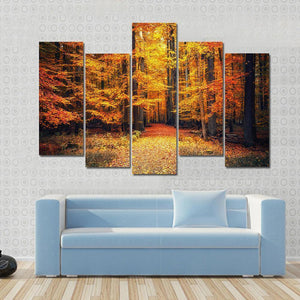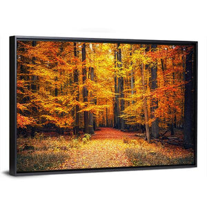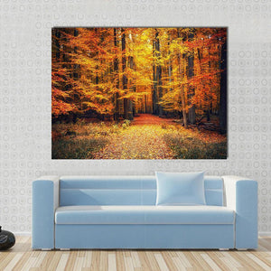 This captivating canvas art features a serene forest path adorned with autumn leaves, inviting you into a world of warm golden light. The realistic depiction captures the beauty of nature, making it a perfect addition to your wall decor.