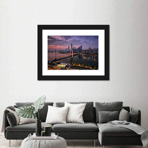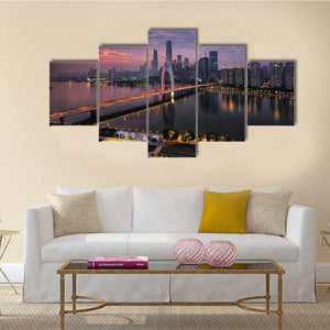 Pearl River New Town in Tianhe shows a city skyline and arch bridge at sunset, with city lights reflected on the river. Rendered in a photorealistic, modern style with purple, blue and orange tones, it suits modern living rooms and office spaces seeking a vibrant, atmospheric focal piece.