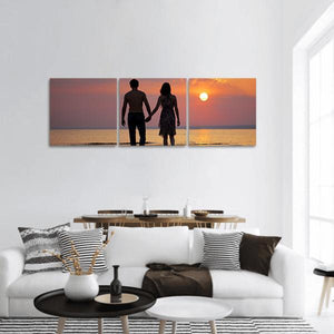 A couple on a beach stands holding hands as the sun reflects on the water in this panoramic sunset scene. Warm oranges, pinks, browns and yellows create a romantic, serene atmosphere in a realistic style. Works well as modern room decor for living rooms or bedrooms.