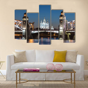 A realistic nighttime cityscape of Peter The Great Bridge and Smolny Cathedral, centered over a river with lights reflecting on the water. The blue, white, gray and yellow palette gives the scene a serene, majestic mood. Suited to modern home room decor, especially living rooms and hallways.